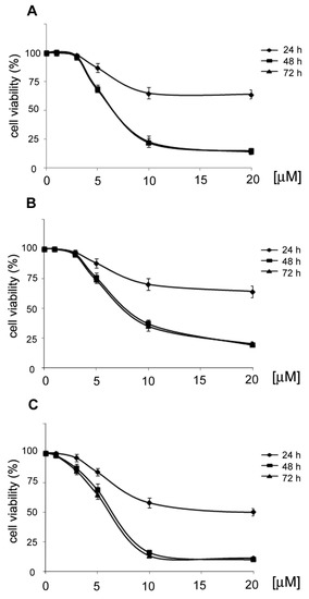 Effects of 11, 12 and 13 on the viability of HeLa cells. HeLa cells were treated with 11 (A), 12 (B) and 13 (C) in the concentration range of 0–20 µM. After 24, 48 and 72 h of incubation, cell viability was assessed with the MTT assay. Values represent the mean ± SD of three independent experiments.