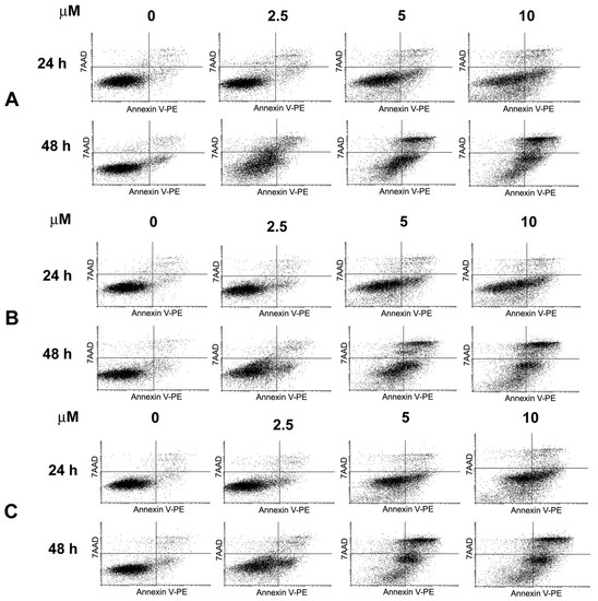 In order to determine whether the anti-proliferative effects of 11, 12 and 13 were associated with their ability to induce apoptosis in HeLa cells, the induction of phosphatidylserine externalization by compounds 11, 12 and 13 was examined by flow cytometric analysis. The cells were treated with 2.5, 5 and 10 µM concentrations of 11, 12 and 13 for 24 and 48 h and stained with Annexin V-PE and 7-AAD. The results shown in Figure 4 indicated that compounds 11–13 induced apoptosis in a concentration- and time-dependent manner. After 24 h of treatment, a significant increase in the early apoptotic population of cells was visible starting from the concentration of 5 µM.