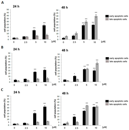 A further 24 h incubation increased the percentage of early apoptotic cells at the lowest examined concentration of 2.5 μM. Furthermore, at higher concentrations of 11, 12 and 13 (5 and 10 µM), a significant increase in cells in the late stage of apoptosis was visible (Figure 5).