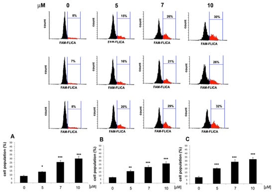 Induction of caspase activity in HeLa cells by 11, 12 and 13. Cells were treated with the indicated concentrations of 11 (A), 12 (B) and 13 (C) for 24 h, and the enzyme activity was determined by flow cytometry with the use of a caspase inhibitor, FAM-VAD-FMK. Values represent the mean ± SD of three independent experiments. Data were analyzed by one-way ANOVA with Tukey’s post hoc test p < 0.05 (*), p < 0.01 (**), p < 0.001 (***).