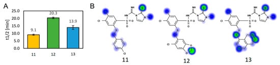 The three most potent compounds (11, 12 13) were tested in an in vitro metabolic stability assay. Human liver microsomes along with NADPH were used to assess their susceptibility to undergo first-phase oxidation reactions. The progress of biotransformation was followed by liquid chromatography–mass spectrometry. The results derived from triplicate incubations, expressed as in vitro metabolic half-life (t½), are shown in Figure 8. In order to support the in vitro results, we performed in silico calculations using the Human Liver Microsome-based model for CYP-mediated oxidations provided by the Xenosite online tool [45].