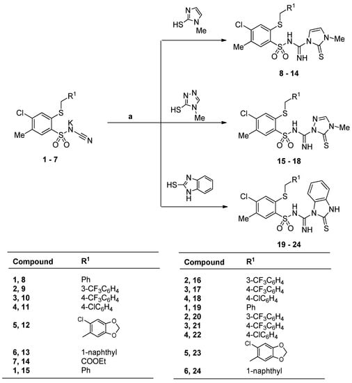 The starting potassium salts 1–7 were obtained according to the reported procedures for the preparation of N-(benzenesulfonyl)cyanamide potassium salts [41,42,43,44]. The novel 2-alkythio-4-chloro-N-[imino-(heteroaryl)methyl]benzenesulfonamide derivatives 8–24 were synthesized by the reaction of the N-(benzenesulfonyl)cyanamide potassium salts 1–7 with 1-methyl-1H-imidazole-2-thiol or 4-methyl-4H-1,2,4-triazole-3-thiol or 1H-benzo[d]imidazole-2-thiol using dry toluene or p-dioxane as a solvent (Scheme 1).