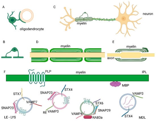 Myelination and protein transport to myelin, mediated by soluble N-ethylmaleimide-sensitive factor attachment protein receptors (SNAREs) in the central nervous system (CNS). (A) An oligodendrocyte during myelination. (B) Each oligodendrocyte can form multiple sheaths around several axons. (C) Neuron showing a partially myelinated axon by an oligodendrocyte and the demyelination process. (D) Longitudinal view of the axon and the myelin sheaths. (E) Longitudinal section of the axon and non-compacted myelin wrapping. (F) Vesicle transport of protein components of the myelin sheath, such as proteolipid protein (PLP) and myelin basic protein (MBP), is regulated by SNARE proteins such as vamp7 (vesicle-associated membrane proteins), stx7 (syntaxin 7) and snap23 (synaptosomal-associated protein 23) transport of PLP in late endosomes (LE)- lysosomes (LYS), stx4, vamp3 and snap23 in recycling vesicles (RE) and by the SNARE complex composed of stx6, vamp4 and snap29 and the rab3a (ras (rat sarcoma)-associated binding protein 3a) GTPase (guanine nucleotide-binding protein). Major dense line (MDL) and intraperiod line (IPL) are indicated in F. Vesicles and relative SNARE proteins, which form a complex, are shown close to the plasma membrane where the fusion of the membranes occurs. Membrane fusion is regulated by rab proteins which can associate with the vesicles.