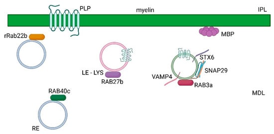 One of the rab proteins which has a role in PLP transport is rab27b. Rab27b colocalized with PLP in late endosomes/lysosomes of mature oligodendrocytes, and it regulated its surface transport and exocytosis. In particular, silencing of rab27b determined the reduction of lysosomal exocytosis and therefore regulated the surface expression of the myelin protein in oligodendrocytes and its release from myelin-like membrane (MLM) formation in oligodendrocytes neuron co-cultures [41].