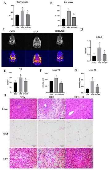 2.1. NR Supplementation Prevents Obesity-Related Metabolic Abnormalities in HFD-Fed Mice