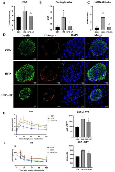 2.2. NR Supplementation Alleviates Insulin Resistance in HFD-Fed Mice