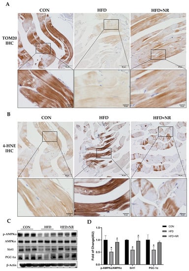 2.4. NR Supplementation Alleviates Mitochondrial Dysfunction Induced by HFD