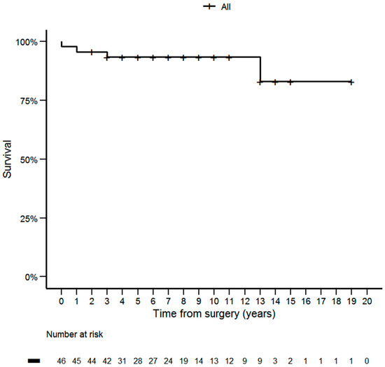An excellent response to primary therapy was observed in 24 patients (52.2%). Twenty patients (43.5%) showed a biochemical incomplete response to initial therapy, whereas two patients (4.3%) showed a structural incomplete response. Twelve patients (26.1%) required additional therapy during the course of the disease. In addition to the EBRT in 12 patients, four required surgical re-treatment (8.7%). One of the 12 patients required additional use of selpercatinib (2.2%). There were four deaths among cases with MTC, but only two cases were MTC-related (Table 2). The Kaplan–Meier curve of overall survival in the years following surgery are shown in Figure 1. The 5-, 10- and 15-year survival rates for the entire cohort were 93.37%, 93.37% and 83%, respectively.