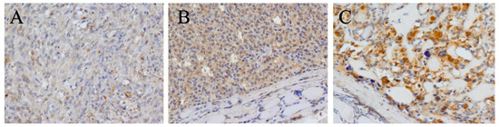 Statistical analysis of the IHC results was performed by dividing the study group into two subgroups. The first subgroup included those with CD276-positive samples with either 1+ or 2+ intensity and 11–50% immunoreactive cells, whereas the second group included those with samples with 2+ or 3+ intensity and 51–100% immunoreactive cells. Thirteen samples (28.3%) had a staining intensity of 1+. Intensity of immunostaining 2+ and 3+ was observed in 24 (52.2%) and 9 (19.6%) samples, respectively. The number of patients and the percentage of CD276-positive cells were as follows: 20 (43.5%) for 11–50%, 21 (45.7%) for 51–75%, and 5 (10.9%) for 76–100% (Table 3). No CD276 immunoreactive cells were observed in the tissues outside the tumor (Figure 2A–C).