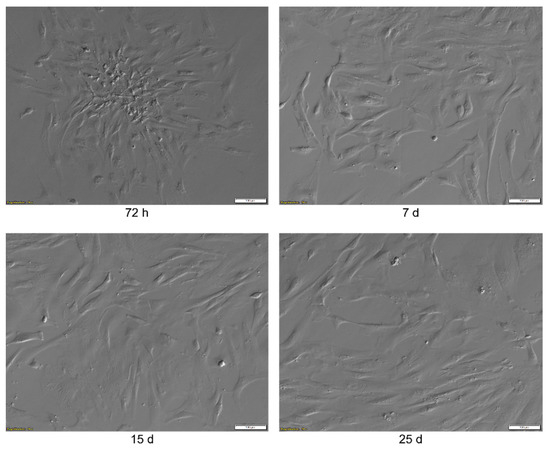 The results of the morphological analysis of the WJ-MSCs primary culture at 72 h, 7, 15 and 25 days. The pictures were taken at a 10× magnification. Scale bar: 100 µm.