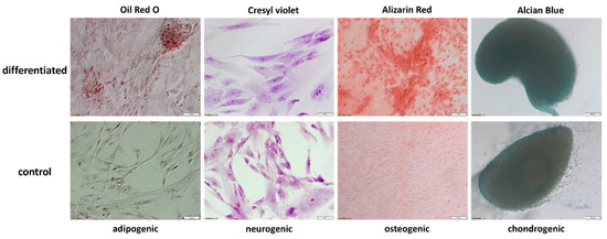 The results of Oil Red O, Cresyl violet, Alizarin Red, and Alcian Blue staining of the control and differentiated WJ-MSCs. The pictures of adipo- and neuro-induced WJ-MSCs were taken at a 20× magnification; scale bar: 50 µm, while the pictures of osteo- and chondro-induced WJ-MSCs were taken at a 10× magnification; scale bar: 100 µm.