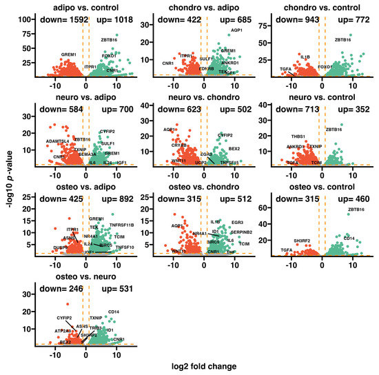 The fold change values of the top ten downregulated genes in adipocytes vs. controls ranged from −504.3 to −63.7, while the expression of the top ten overexpressed genes ranged from 12.7 to 2263.5. The fold change values of the top ten downregulated genes in chondrocytes vs. controls ranged from −493.4 to −45.5, while the expression of the top ten overexpressed genes ranged from 9.3 to 632.5. Moreover, the fold change values for genes mostly downregulated in neural-like cells vs. controls ranged from −93.2 to −26.6, while the upregulated genes ranged from 3.5 to 83.7. For the osteoblasts to control comparison, the fold change for inhibited genes ranged from −527.5 to −4.4, and those of overexpressed genes ranged from 9.0 to 384.1. In conclusion, the commonly overexpressed genes in differentiated groups are ZBTB16 and FOXO1, while TGFA was a downregulated gene in all differentiated cells. All genes are presented in Figure 4.