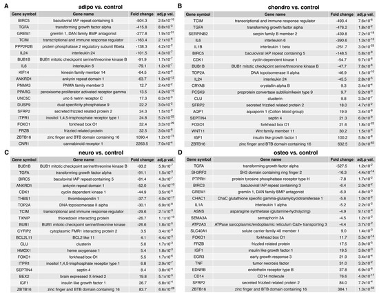 List of the top 20 genes with the highest (10 genes) and lowest (10) expression fold change between (A) adipocytes vs. control; (B) chondrocytes vs. control; (C) neural-like cells vs. control; and (D) osteoblasts vs. control. Abbreviations: adj. p val.—adjusted p-value.