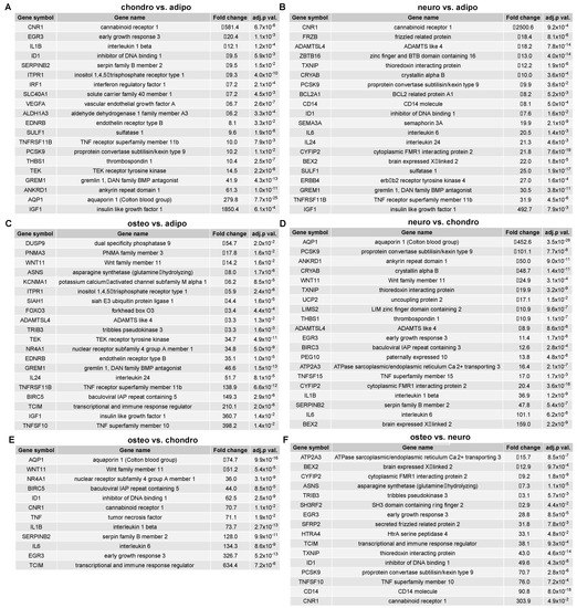 List of the genes with the highest and lowest expression fold change between all analyzed groups: (A) chondrocytes vs. adipocytes; (B) neural-like cells vs. chondrocytes; (C) osteoblasts vs. adipocytes; (D) neural-like cells vs. chondrocytes; (E) osteoblasts vs. chondrocytes; (F) osteoblasts vs. neural-like cells. Abbreviations: adj. p val.—adjusted p-value.