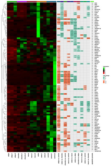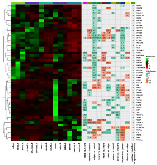 As the next step, we performed a hierarchical clustering of differentially expressed genes in all analyzed groups and presented the results as heatmaps, which are presented in Figure 6, Figure 7, Figure 8 and Figure 9. The figure shows the mean expression values, normalized expression values, and fold changes between the compared groups. Genes that belong to the most significantly enriched ontological groups (with the lowest adjusted p-value) are represented as dark squares. The expression values were scaled by rows and presented as colors and ranges, wherein the fold changes were displayed in the rows. As a first step, we revealed which genes are involved in the apoptotic processes (Figure 6) depending on the differentiated cells, most of which were downregulated. In the adipocytes vs. controls, the genes most differentially expressed were BIRC5, GREM1, TCIM, PPP2R2B and IL24, all of which were downregulated. For the chondrocytes vs. controls, there was a downregulation of TCIM, IL1B, BIRC5, CDK1, and BUB1B. Meanwhile, at the neural-like cells, it appears that BUB1B, BIRC5, CDK1, TCIM, and BUB1 were downregulated. Regarding the comparison of the osteoblast cells and control, it appears that apoptotic processes are involved through the expression of the CD14, SLC40A1 and CHI3L1 genes. GREM1, NLRP1 and DAB2 were the genes downregulated across all the studied groups compared to the controls. Furthermore, we analyzed the genes related to the apoptosis intrinsic apoptotic signaling pathway in response to endoplasmic reticulum stress (Figure 7). ITPR1 was the only overexpressed gene in all the differentiated groups compared to controls. In the analysis of the genes related to the negative regulation of the apoptotic process (Figure 8), we found that the expression of TGFA, GREM1, CD44, SH3RF1, DAB2, SH3RF2, PLAUR, SMAD3 and AXL was decreased in all differentiated groups as compared to the controls. Moreover, genes related to the positive regulation of the apoptotic process were clustered (Figure 9). These analyses reveal that the expression of the ZBTB16, FOXO1, SEPTIN4, CLU and HTRA1 genes was enhanced in all analyzed groups compared to the controls.