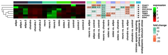 Chondrogenically, adipogenically, neurogenically and osteogenically differentiated WJ-MSCs were related to each other and to WJ-MSCs not subjected to any differentiation regimen to search for the effects on the expression of apoptotic-related genes. Subsequently, a set of differentially expressed genes belonging to apoptosis-related ontological groups, namely “apoptotic process”, “intrinsic apoptotic signaling pathway in response to endoplasmic reticulum stress”, “negative regulation of apoptotic process”, and “positive regulation of apoptotic process”, was identified.