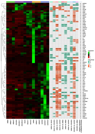 A list of the top 20 genes with the highest (10 genes) and lowest (10 genes) expression fold change in adipocytes, chondrocytes, neural-like cells and osteoblasts in contrast to the controls as well as a comparison between the groups is presented in Figure 4 and Figure 5.