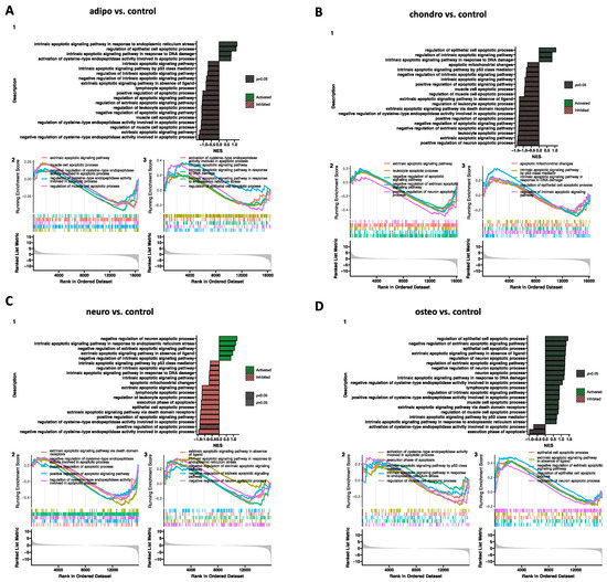 Gene set enrichment analysis (GSEA) for the comparison of the control to all analyzed groups; (A) adipo-induced WJ-MSCs vs. control; (B) chondro-induced WJ-MSCs vs. control; (C) neuro-induced WJ-MSCs vs. control; (D) osteo-induced WJ-MSCs vs. control. (1) Barplot with the most activated (green) and inhibited (red) gene terms according to the normalized enrichment score (NES) values. (2/3) Detailed enrichment plots for the five most inhibited/activated gene sets, showing the profile of the running ES score and the positions of the genes on the rank-ordered list.