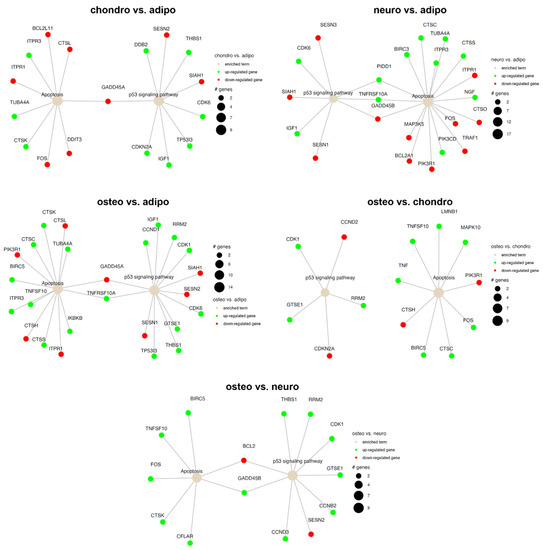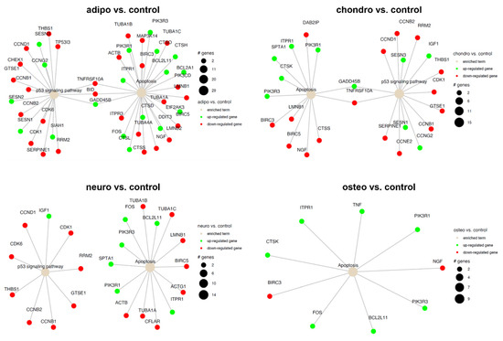 Apoptosis and p53 signaling pathway in the control compared to adipocytes, chondrocytes, neural-like cells and osteoblasts. Changes in the expression profile of genes involved in the pathway are marked in green for statistically significant upregulation and red for statistically significant downregulation. The beige color indicates the enriched term. The size of the bubble corresponds to the number of genes involved in a particular GO term.