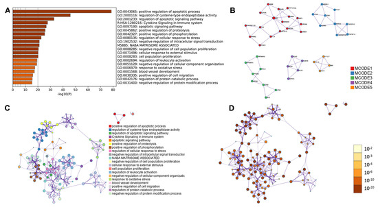 Moreover, to conduct a comprehensive functional analysis of protein–protein interactions, a functional enrichment interactome analysis, gene annotation, and a membership search, we employed the online platform Metascape. For the analysis, we utilized four lists of differentially expressed genes that were categorized according to Gene Ontology biological process (GO BP) terms and obtained from heatmaps. We identified all the statistically enriched Gene Ontology (GO) terms, among which the top five enriched processes were: positive regulation of apoptotic process (GO:0043065; log10(P) = −78.6); regulation of cysteine-type endopeptidase activity (GO:2000116, log10(P) = −45.9); regulation of the apoptotic signaling pathway (GO:2001233, log10(P)= −32.9); cytokine signaling immune system (R-HAS-1280215, log10(P) = −27.7); and the apoptotic signaling pathway (GO:0097190, log10(P) = −26.7) (Figure 14A). A subset of representative terms was chosen from the entire cluster, converted into a network layout (Figure 14C,D), and analyzed using the MCODE algorithm to identify densely connected neighborhoods of proteins (Figure 14B).
