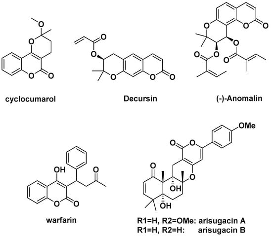 Decursin and its derivatives from the herb Angelica gigas possess potent antiandrogen receptor activities and induce cell cycle arrest and caspase-mediated apoptosis []. Anomalin, isolated from Angelica anomala Ave-Lal for the first time, has been shown to have many biological activities, including anti-inflammatory, analgesic, antioxidant, antitumor, hepatoprotective, and neuroprotective activities []. Arisugacin A and B, isolated from a culture broth of Penicillium sp. FO-4259, have been shown to have selective inhibitory effects against acetylcholinesterase with half maximal inhibitory concentration (IC50) values of 1 and 26 nM, respectively [,,]. Therefore, we expect that the newly synthesized pyranocoumarins may also show interesting biological activities (Figure 1).
