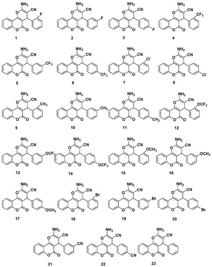 Pyranocoumarins can be synthesized via the three-component Diels–Alder reaction among 4-hydroxycoumarin, malononitrile, and various benzaldehydes (Scheme 1). To expand the diversity of pyranocoumarins, various benzaldehydes were used for their synthesis (Figure 2). The detailed synthetic procedure for pyranocoumarin derivatives is described in the Supporting Information (Supplementary S1). The synthesized pyranocoumarins were identified via nuclear magnetic resonance and liquid chromatography–mass spectrometry (LC–MS).