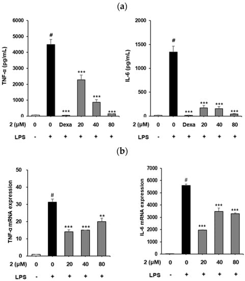 As shown in Figure 3a, compared with the LPS treatment, the sample treatment group significantly reduced the LPS-induced IL-6 and TNF-α levels in a concentration-dependent manner at all concentrations (20, 40, and 80 μM). In addition, mRNA expression involved in IL-6 and TNF-α production was analyzed. The effect of LPS on mRNA expression was significantly suppressed after treatment with coumarin derivative 2 (Figure 3b).