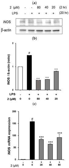 Effect of coumarin derivative 2 on iNOS protein expression in LPS-stimulated RAW264.7 cells. (a) RAW264.7 cells (2.0 × 106 cells/6 cm dish) were pretreated with coumarin derivative 2 (20, 40, and 80 μM) for 2 h and incubated with LPS (500 ng/mL) for 20 h. Whole-cell lysates were then immunoblotted with the iNOS specific antibody. Actin was used for loading control. (b) iNOS protein expression levels and total protein were verified with Image J software 1.8.0. β-Actin was used as a control. (c) RAW264.7 cells (2.0 × 106 cells/6 cm dish) were pretreated with coumarin derivative 2 (20, 40, and 80 μM) for 2 h and incubated with LPS (500 ng/mL) for 6 h. iNOS mRNA expression levels were measured via a real-time quantitative reverse transcription polymerase chain reaction. Data are presented as the mean ± standard deviation of three independent experiments. (−): nontreated group; (+): LPS-treated group. # p < 0.0001 vs. the control group. *** p < 0.0001 vs. the LPS group.
