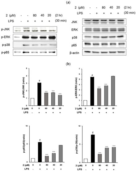 Inhibitory effects of coumarin derivative 2 on LPS-induced phosphorylation of MAPKs and NF-κB p65 in RAW264.7 cells. (a) RAW264.7 cells (2.0 × 106 cells/6 cm dish) were pretreated with coumarin derivative 2 (20, 40, and 80 μM) for 2 h and incubated with LPS (500 ng/mL) for 30 min. Whole-cell lysates were then immunoblotted with the specific antibodies indicated in the left panel. (b) phospho-JNK, phospho-ERK, phospho-p38, and phospho-p65 protein expression levels and total protein were verified by Image J software. Actin was used as the control. Data are presented as the mean ± standard deviation of three independent experiments. (−): nontreated group; (+): LPS-treated group. # p < 0.0001 vs. the control group. *** p < 0.0001 vs. the LPS group.