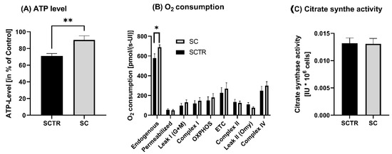 First, we examined the cells for various mitochondrial functions, including ATP levels, respirometry and related citrate synthase activity. Incubation with SC resulted in a significant increase in ATP levels compared to control (p = 0.0031, Figure 2A). Since the increased ATP levels may be due to a change in the activity of respiration chain complexes, respiration was investigated next. A significant increase in endogenous respiration of SC compared to SCTR was found (p = 0.0314). Except for complex II and leak II, the O2 consumption of SC tended to be higher than that of SCTR (Figure 2B). However, the changes were not significantly different. Moreover, there was no difference in the mitochondrial mass marker citrate synthase activity between the groups (Figure 2C).