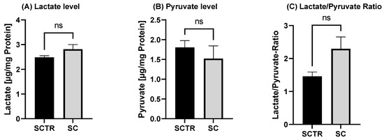 Effect of the on lactate and pyruvate level after 24 h of incubation with SC or the control. (A) Lactate level of SH-SY5Y-APP695 cells after the incubation compared to the control. (B) Pyruvate level of SH-SY5Y-APP695 cells after the incubation with SC compared to the control. (C) Lactate to pyruvate ratio. N = 10. Levels were adjusted to the protein content. Significance was determined using Student’s unpaired t-test. ns = not significant. Data are displayed as ±SEM.