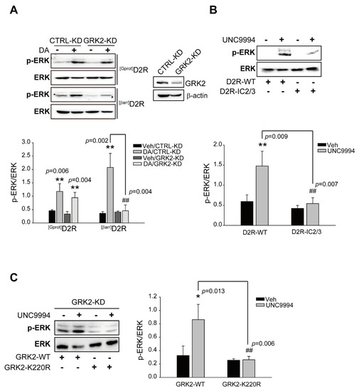 A growing body of evidence demonstrates that GRK2 plays a key role in the control of GPCR-mediated ERK activation [36,37]. We employed GRK2-KD cells to determine the exact roles of GRK2 in DA-mediated ERK activation. As shown in Figure 1A, the knockdown of GRK2 diminished [βarr]D2R-, not [Gprot]D2R-, mediated ERK activation, indicating that GRK2 is responsible for D2R β-arrestin signaling-pathway-mediated ERK activation. It has been previously reported that ERK activation, regardless of GRK2-mediated receptor phosphorylation, one of the best-established cellular events, is the determiner of signaling transduction via GPCRs. For example, GRK2 acts as a RhoA-activated scaffold protein for the ERK MAP kinase cascade or regulation of ERK activity through direct or coordinated interaction with MEK [37,38]. To examine the involvement of GRK2-mediated receptor phosphorylation in D2R β-arrestin pathway-mediated ERK signaling, a specially designed construct, D2R-IC2/3, was then utilized. In D2R-IC2/3, all serine and threonine residues in the second and third intracellular loops of D2R were substituted to alanine and valine residues, respectively, making it beneficial for studying receptor phosphorylation-independent cellular processes [39]. Our data showed that D2R-IC2/3 caused a reduced level of ERK activation upon stimulation via the agonist UNC9994, which effectively activates β-arrestin-biased D2R signaling pathways [40] (Figure 1B). Moreover, GRK2-K220R, a GRK2 mutant devoid of enzymatic activity [41], was employed to determine whether the kinase activity of GRK2 is required for ERK activation. As shown in Figure 1C, ERK activation induced by UNC9994 was rescued only by GRK2-WT, but not by GRK2-K220R, in GRK2-KD cells. These results suggest that the GRK2-mediated phosphorylation of receptors is required for D2R β-arrestin pathway-mediated ERK signaling.
