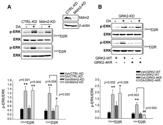 The ubiquitination of GRK2 is involved in D2R β-arrestin pathway-mediated ERK activation. (A) CTRL-KD and Mdm2-KD cells were transfected with plasmids encoding [Gprot]D2R or [βarr]D2R. Serum-starved cells were stimulated with 10 μM DA for 2 min ([Gprot]D2R producing) or 10 min ([βarr]D2R producing). CTRL-KD and Mdm2-KD cell lysates were immunoblotted using p-ERK1/2 (1:1000 dilution) and ERK2 (1:1000 dilution) antibodies, respectively. Cell lysates were immunoblotted with Mdm2 or β-actin antibodies. About 86% of the Mdm2 levels in cells were diminished. ** p < 0.01 compared with the corresponding Veh group, # p < 0.05 compared with the DA stimulation group (n = 3). (B) GRK2-KD cells were transfected with plasmids encoding [Gprot]D2R or [βarr]D2R, and co-transfected with plasmids encoding GRK2-WT or GRK2-4KR. Serum-starved cells were treated with 10 μM DA for 2 min ([Gprot]D2R-producing) or 10 min ([βarr]D2R-producing). Cells lysates were immunoblotted using p-ERK1/2 (1:1000 dilution) and ERK2 (1:1000 dilution) antibodies, respectively. We measured the levels of p-ERKs and total ERKs in the same sample and then divided the amount of pERKs by the amount of total ERKs to obtain the p-ERK/ERK ratio. The pERK/ERK ratio provided a normalized measure of ERK pathway activation. ** p < 0.01, * p < 0.05 compared with the corresponding Veh group, ## p < 0.01 compared with the DA/GRK2-WT/[βarr]D2R expression group (n = 3).