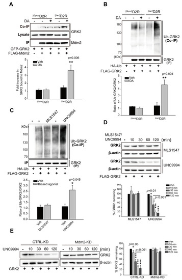 Our data showed that GRK2 ubiquitination is involved in D2R β-arrestin pathway-mediated ERK activation; we were interested in determining whether the Mdm2-mediated ubiquitination of GRK2 increased upon stimulation of the D2R β-arrestin signaling pathway. As shown in Figure 3A,B, the activation of [βarr]D2R, not [Gprot]D2R, strongly increased the interaction between GRK2 and Mdm2, with a concomitant increase in GRK2 ubiquitination. Additionally, GRK2 ubiquitination was investigated via employing the biased ligand MLS1547 or UNC9994, which effectively activates G protein- or β-arrestin-biased D2R signaling pathways, respectively [40,42]. As shown in Figure 3C, the stimulation of D2R with UNC9994 led to an increase in the ubiquitination of GRK2. These data suggest that the Mdm2-mediated ubiquitination of GRK2 is controlled by the activation of the D2R β-arrestin signaling pathway.