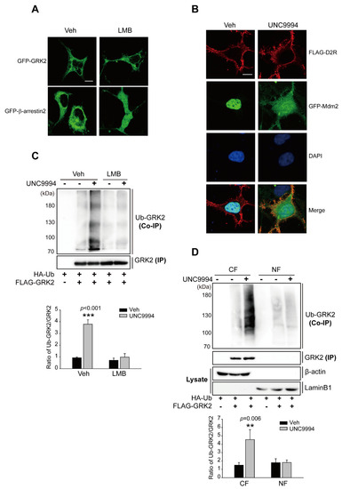 Mdm2 and GRK2 must co-localize in the same intracellular compartment for the Mdm2-mediated ubiquitination of GRK2. Mdm2, an E3 ubiquitin ligase, is located in the nucleus at resting state but translocates to the cytoplasm when certain external stimuli are applied [43]. Previous studies have reported that GRK2 is located in the nucleus of neuronal cells in the striatum [44]; however, it is worth noting that GRK2 contains three modular domains, including the N-terminal RGS homology (RH) domain, the bilobular central kinase domain, and the C-terminal pleckstrin homology (PH) domain [45], but does not have a canonical nuclear localization sequence (NLS) or nuclear export signal (NES) [46]. In the present study, we observed that GRK2 localized in the cytoplasm regardless of pretreatment with leptomycin B (LMB), which has been utilized to prevent NES-mediated nuclear export by interacting with CRM1, a receptor for the NES [47] (Figure 4A), indicating that GRK2 does not shuttle between the cytoplasm and nucleus. Mdm2, which was exclusively localized in the nucleus of resting HEK 293 cells, moved out of the nucleus and was disseminated throughout the nucleus as well as cytoplasm upon D2R β-arrestin pathway activation through UNC9994 (Figure 4B). These results suggest that Mdm2, not GRK2, shuttles between the nucleus and cytoplasm in HEK 293 cells. Thus, it could be speculated that the stimulation of the D2R β-arrestin pathway enhanced Mdm2 nuclear export, resulting in GRK2 ubiquitination in the cytoplasm. To test this hypothesis, Mdm2 was forcibly detained in the nucleus via pretreatment with LMB, and the resulting effects on GRK2 ubiquitination were examined. LMB pretreatment blocked the UNC9994-induced nuclear export of Mdm2 (Figure S3) and GRK2 ubiquitination (Figure 4C), suggesting that Mdm2-mediated GRK2 ubiquitination occurs in the cytoplasm. This conclusion was supported by additional direct biochemical evidence. When cells were treated with UNC9994, GRK2 ubiquitination levels increased in the cytoplasmic, but not the nuclear fraction (Figure 4D). The protein level of GRK2 in the nuclear fraction was much lower than that of the cytoplasmic fraction. This might be due to the fact that GRK2 is a cytoplasmic protein that does not shuttle between the nucleus and cytosol (Figure 4A). The successful separation of nuclear and cytoplasmic fractions has been demonstrated through the absence of β-actin in the isolated nucleus fraction and of laminB1 in the isolated cytosol fractions.