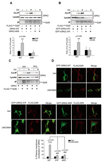 2.6. The Ubiquitination of GRK2 Is Needed for Its Translocation to the Plasma Membrane and Interaction with D2R