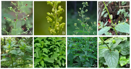 Morphological characters of four Scrophularia species. (A,E) Flowers and leaves of S. ningpoensis, (B,F) flowers and leaves of S. buergeriana, (C,G) flowers and leaves of S. kakudensis, and (D,H) flowers and leaves of S. yoshimurae, respectively.
