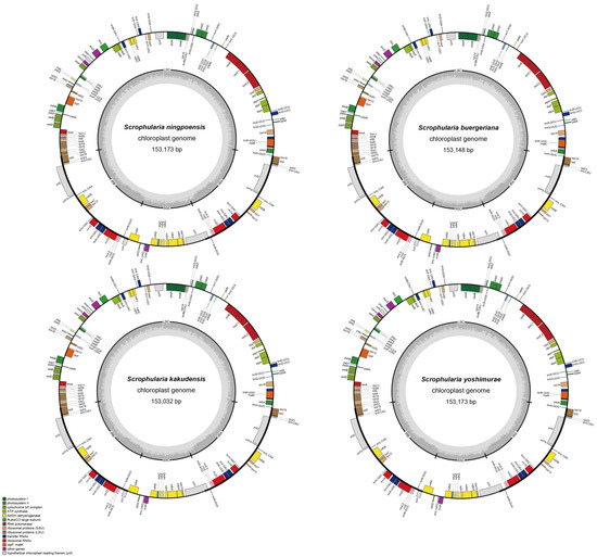 The chloroplast genome serves as a valuable resource for investigating plant evolution, phylogenetics, and genetic diversity [42,43,44]. Scrophularia comprises more than 250 species; despite the diverse range of species in this genus, only a limited number of chloroplast genome sequences have been deposited into GenBank [32,45]. In particular, the S. ningpoensis complex is a group of perennial herbs with pharmaceutical properties that have been applied in traditional Asian medicine for hundreds of years [4,8]. This study reports the complete chloroplast genomes of four Scrophularia species, including S. ningpoensis, S. buergeriana, S. kakudensis, and S. yoshimurae, among which the S. yoshimurae cp genome is reported for the first time, while the cp genomes of S. ningpoensis, S. buergeriana, and S. kakudensis have been reported before, but this is the first systematic comparison and analysis of the cp genomes of all four species. The comparative analysis revealed that the chloroplast genome structure and features were highly conserved relative to nuclear and mitochondrial genomes within the four species. The determined nucleotide sequences of the 4 species’ chloroplast genomes ranged narrowly from 153,016 bp to 153,631 bp, with a similar gene pattern of 132 genes, which has been observed in other Scrophularia plants (Figure 2, Table 1) [32,45]. The LSC region contains most of the genes required for chloroplast function, including those involved in photosynthesis, carbon fixation, and amino acid synthesis; the SSC region contains a smaller number of genes, including those involved in RNA processing and protein synthesis; the IR regions contain genes involved in photosynthesis, as well as rRNA genes and tRNA genes [46,47,48]. The observed conservation of the S. ningpoensis complex’s chloroplast genomes can be attributed to the similarities in the morphological characters and habitat preferences, as well as the low rate of chloroplast substitution [27,45].