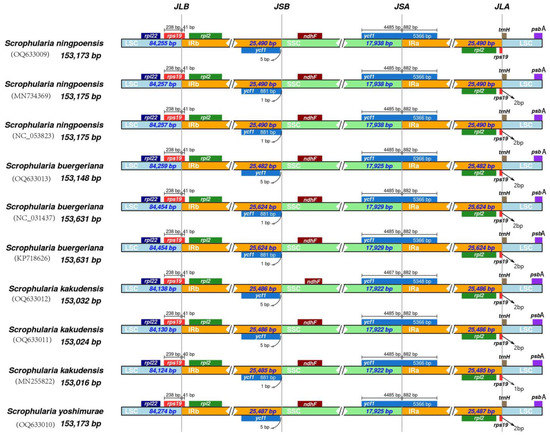 Comparison of LSC, IR, and SSC junction position among ten individuals from four Scrophularia species in cp genomes. JLB means the LSC/IRb junction, JSB means the SSC/IRb junction, JLA means the LSC/IRa junction, and JSA means the SSC/IRa junction.