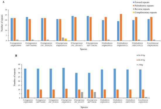 Repeat analyses in ten chloroplast genomes of Scrophularia. (A) Frequency of repeat types. (B) Frequency of repeats by length.