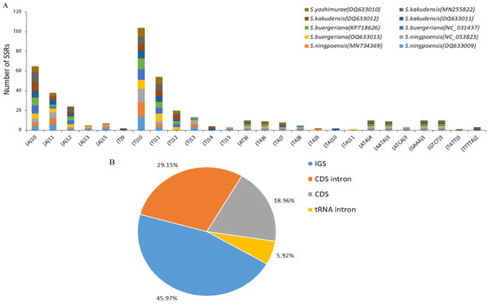 Simple sequence repeats (SSRs) in the ten Scrophularia chloroplast genomes. (A) Number of SSRs by length. (B) Distribution of SSR loci. CDS, coding DNA sequence; IGS, intergenic spacer region.