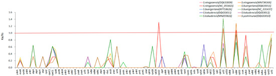 In genetics, the ratio of nonsynonymous (Ka) to synonymous (Ks) substitution rates (ω) is frequently used to evaluate the presence of selection pressure on protein-coding genes [88]. In this study, we used a Perl script to extract protein-coding genes from the chloroplast genome of Scrophularia, used Geneious to extract CDS, and calculated Ka, Ks, and Ka/Ks values for each plastid gene with TBtools V1.113 [89]. The evolutionary process of genes, i.e., positive selection, purified selection, or neutral selection, is Ka > Ks (ω > 1), Ka < Ks (ω < 1), or Ka = Ks (ω = 1), respectively.