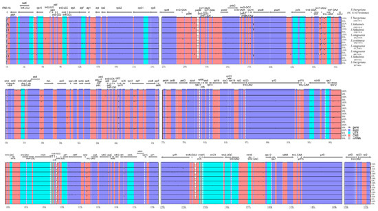 To compare the chloroplast genomes among the four Scrophularia species, the mVISTA program (Berkeley, CA, USA) (https://genome.lbl.gov/vista/mvista/submit.shtml, accessed on 20 July 2022) was used for genome comparison. The LAGAN mode was employed with default parameters to align the ten chloroplast genomes [90]. The gene, exon, UTR, CNS, and mRNA of these sequences were compared using the mVISTA for complete sequence alignment with settings of 70% and window length of 100 bp.