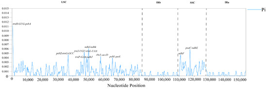 The nucleotide variation (Pi) values of 10 Scrophularia genomes were compared, with nucleotide diversity at the midpoint of the window on the x axis and within each window on the y axis (window length: 600 bp, step length: 200 bp).