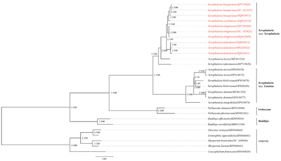 A total of 28 chloroplast genomes of 7 genera in Scrophulariaceae were selected for phylogenetic tree construction (Table S8). Among them, there were 19 species in Scrophularia, including 2 Verbascum; 2 Buddleja; 2 Myoporum; 1 each for Diocirea, Eremophila, and Leucophyllum; and a total of 9 individuals as outgroup. We used MAFFT V7 [92] to compare these 28 plastid sequences under default parameters. The maximum likelihood method was used to construct the phylogenetic tree using IQ-TREE V1.6.8 [93], and the model was TVM+F+R2. In jModelTest v2.1.10 [94], the TVM+I+G substitution model was determined according to the Bayesian Information Criterion (BIC), and the phylogenetic tree was constructed by the Bayesian method in MrBayes V3.2.7 [95]. Monte Carlo Simulation and Markov Chain (MCMC) algorithm were used for 2 million generations. The tree was sampled every 500 generations, and the checkfreq was 5000 times. The first quarter of the calculated tree was discarded, and the Bayesian phylogenetic tree was constructed from the remaining trees [32].