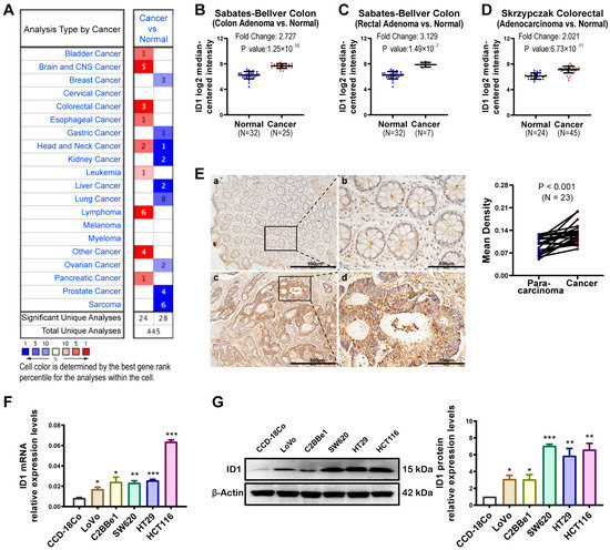 ID1 expression level in primary colorectal adenocarcinoma patient samples and colon cell lines. (A) The mRNA expression level of ID1 in different cancers based on ONCOMINE gene expression array dataset analysis. (B) ID1 mRNA expression levels in colon adenoma compared with normal controls based on the analysis of the Sabates-Bellver colon microarray data [19]. (C) ID1 mRNA expression levels in rectal adenoma compared with normal controls based on analysis of the Sabates-Bellver colon microarray data [19]. (D) ID1 mRNA expression levels in adenocarcinoma compared with normal controls based on analysis of the Skrzypczak colorectal microarray data [20]. (E) Left: immunostaining for ID1 in paraffin sections of para-carcinoma tissues and cancer tissues from patients with colon adenocarcinoma (magnification, ×100, scale bars = 500 μm (a,c); ×400, scale bars = 100 μm (b,d)). Right: mean density of ID1 in IHC in colon para-carcinoma and cancer tissues from 23 cases; significance determined by Student’s t-test. (F) Expression of ID1 mRNA and (G) protein levels in human colon cell lines; significance determined by one-way ANOVA. Data are shown as mean ± S.D., n = 3. * p < 0.05, ** p < 0.01, *** p < 0.001.