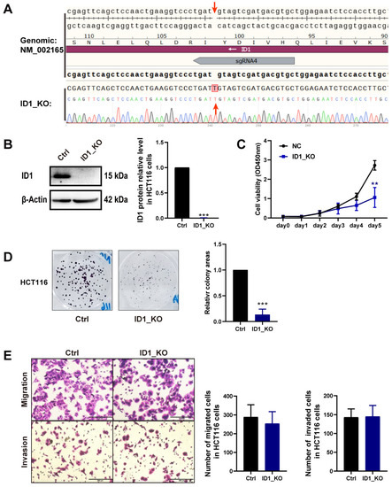 ID1 knockout decreases HCT116 cell proliferation and colony formation. (A) Knockout genomic sequence showing a single base insertion, introduced by genome editing, leading to a frameshift mutation in the ID1 gene. (B) Left: ID1 protein expression was detected using WB after ID1 knockout. Right: statistic of the relative mean density of ID1 protein expression level. (C) Cell proliferation was quantified with CCK 8 assay after ID1 knockout. (D) Left: colony formation was measured after ID1 knockout. Right: statistic of the relative colony areas. (E) Left: cell migration and invasion were quantified with transwell assays after ID1 knockout; right: statistic of the number of migrated and invaded cells; Scale bars = 200 μm. The significance for all data except (A) was determined using Student’s t-test. Data are shown as mean ± S.D., n = 3. ** p < 0.01, *** p < 0.001.