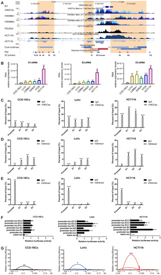 We next characterized the histone modifications in the three cell lines by ChIP-qPCR. The three putative enhancer regions harbored H3K27ac and H3K4me1 but a low level of H3K4me3 modifications (Figure 4C–E), which coincides with features of enhancer domains [23]. As shown in Figure 4C, H3K27ac was enriched at all three putative enhancer regions and ID1 promoter, but the enrichment levels gradually increased in the order of in CCD-18Co, LoVo and HCT116 cells. The enrichment level of H3K27ac is in line with ID1 and eRNA expression levels among the three cell lines (Figure 1F and Figure 4B). This result implies that the ID1 promoter and enhancers have higher activities in CRC cell lines, especially in the HCT116 cell line.