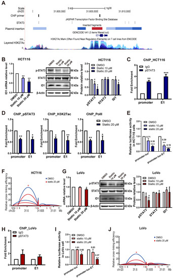 To explore enhancer function in regulating the expression of ID1 and identify the TFs that mediate enhancer activity, we first searched the literature for TFs that regulate ID1 expression, which were then used as candidates to screen for binding to the E1 enhancer region by using Transcription Factor Binding data in the JASPAR 2022 UCSC tracks [24]. Prior reports show that STAT3 up-regulates ID1 expression by binding to the ID1 promoter in the glioblastoma [7]. A JASPAR database search revealed that the enhancer E1 region contains a putative STAT3-binding site (Figure 5A). The active form STAT3 is pSTAT3, which forms STAT3 homodimers and then translocates into the nucleus where it initiates the transcription [25,26] and is generally used for measuring STAT3 transcription regulation activity. Stattic is a non-peptidic small molecule that specifically inhibits STAT3. Stattic dose-dependently inhibited STAT3 phosphorylation (Figure 5B right). In HCT116 cells, ID1 mRNA decreased in parallel with the reduction of pSTAT3 (Figure 5B left). Treatment with 20 µM Stattic for 1 h caused a significant decrease in ID1 protein levels (Figure 5B). Further, we validated the binding of pSTAT3 at the predicted STAT3 binding sites of E1 and ID1 promoter by ChIP-qPCR. The ChIP-qPCR results demonstrated a relative enrichment of pSTAT3 at the ID1 promoter and E1 enhancer region (Figure 5C). When treated with 20 µM Stattic for 1 h, the ID1 promoter and E1 enhancer regions showed decreased enrichment of pSTAT3, H3K27ac and RNA polymerase II (PolII) (Figure 5D). When treated with Stattic at 10 µM, the luciferase activities of promoter-luc-E1 and promoter-luc plasmid decreased 61% and 29%, respectively; when treated with 20 µM Stattic, the luciferase activities of promoter-luc-E1 and promoter-luc plasmid decreased 81% and 65%, respectively (Figure 5E). This result shows that the luciferase activity of the promoter-luc-E1 plasmid is more sensitive to the decrease of pSTAT3 than the promoter-luc plasmid, suggesting that STAT3 can influence ID1 promoter activity by regulating E1 enhancer activity. In addition, the 3C assay showed that ID1 promoter/E1 looping is decreased by Stattic treatment (Figure 5F). These results indicate that, besides direct regulation by binding to the ID1 promoter, STAT3 regulates the expression of ID1, probably by increasing the chromatin looping frequency between the ID1 promoter and E1 enhancer, as well as the activated state of the ID1 promoter and E1 enhancer chromatin.