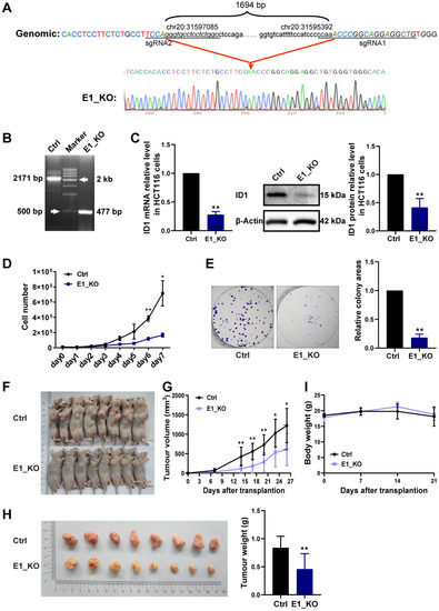 The above results show active enhancer E1 can regulate ID1 expression in CRC. However, the independent roles of the E1 in ID1 expression are unknown. Therefore we conducted knockout of the E1 DNA fragment (1694 bp) from the genome using CRISPR-Cas9 (Figure 6A,B). E1 knockout (E1_KO) down-regulated the ID1 expression level (Figure 6C). Since ID1 promotes CRC cell survival and proliferation (Figure 2 and Figure 3), we characterized the cell proliferation and colony formation of HCT116 E1_KO in vitro and in nude mice. E1 knockout (E1_KO) inhibited proliferation and colony formation of HCT116 cells (Figure 6D,E). Mice were given a subcutaneous injection of HCT116 control cells or E1 knockout HCT116 (E1_KO) cells. At the end of the experiment (day 26), the mice injected with E1_KO cells exhibited smaller tumor sizes and tumor weights than those injected with the HCT116 control cells (Figure 6F–H). No significant differences in body weight were found between the two groups of mice during the course of the experiments (Figure 6I).
